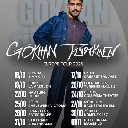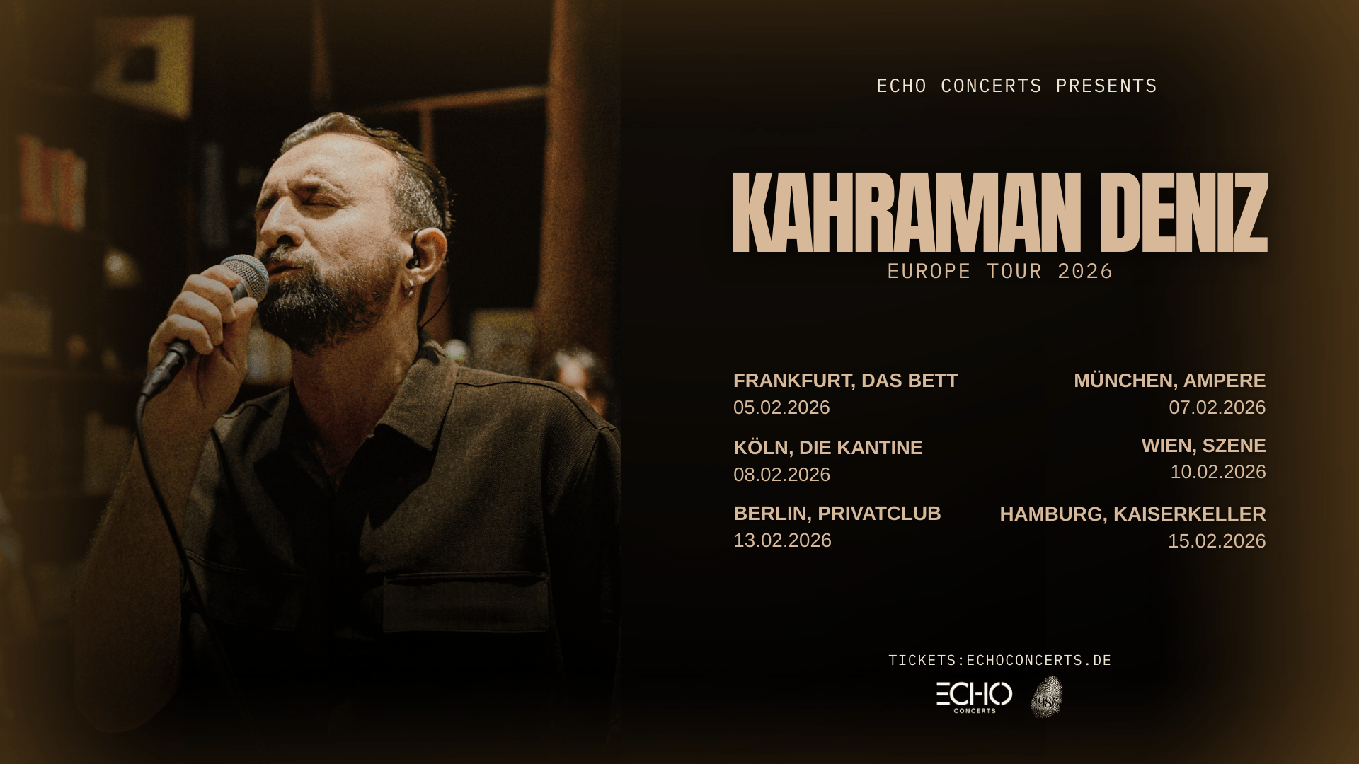 Kahraman Deniz geht 2026 erstmals auf große Europa-Tour. Mit seiner charakteristischen Stimme, tiefgründigen Lyrik und einer einzigartigen Mischung aus modernen Singer-Songwriter-Elementen und anatolischen Einflüssen begeistert er Fans in zahlreichen europäischen Städten. Die Tour führt ihn unter anderem nach Frankfurt, München, Köln, Wien, Berlin und Hamburg. Besucher dürfen sich auf intime, emotionale und kraftvolle Live-Momente freuen. Tickets sind ab sofort unter echoconcerts.de erhältlich.